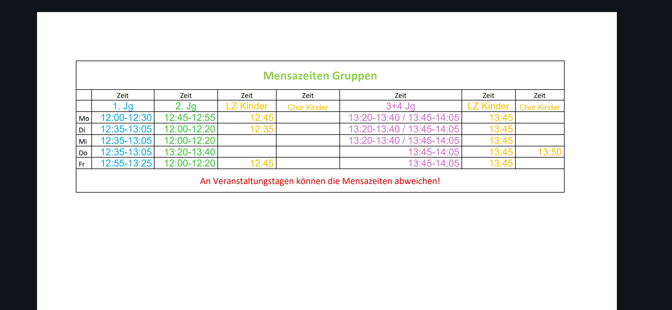 um einen guten Ablauf in unserer Mensa zu gewährleisten, haben wir unsere Mensazeiten angepasst. Bitte beachten Sie, dass Ihr Kind möglicherweise nur kurz oder gar keine Zeit hat, um am warmen Mittagessen teilzunehmen.